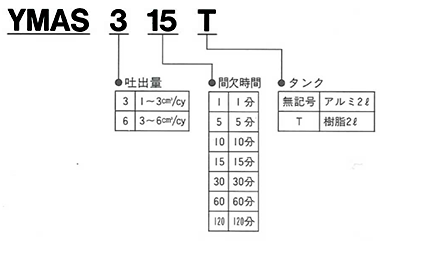 | 形式記號(hào) | 間欠時(shí)間 (分) | 吐出量 (c?/cy) | 最大吐出圧 (MPa) | 吐出口徑 (Rc) | モーター出力 (W) | タンク容量 (?) | 有効容量 (?) |